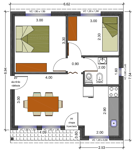 Vivienda de 47 metros cuadrados, dos dormitorios, cocina semi separada y comedor, baño y porche.