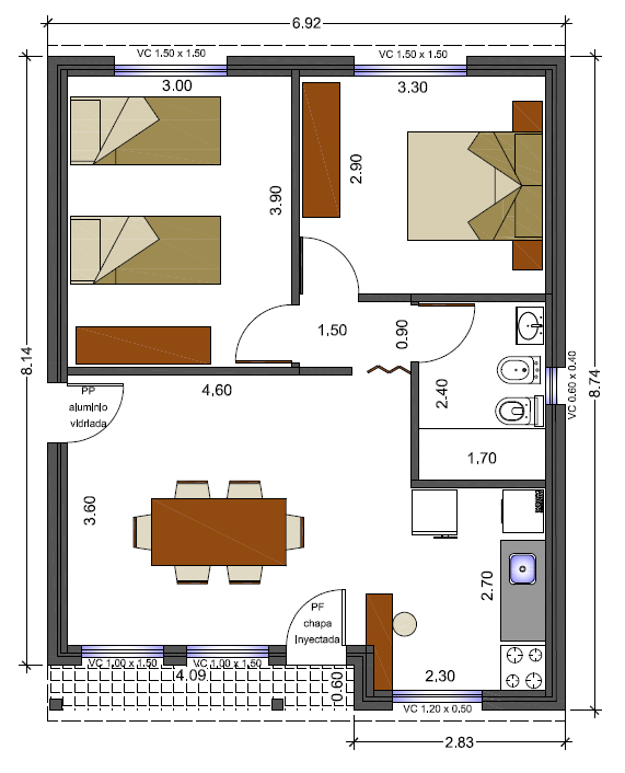 Vivienda de 60 metros cuadrados, dos dormitorios amplios (para hasta 3 camas), cocina semi separada, comedor, baño y porche